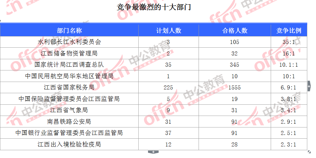 為幫助廣大考生更清晰的了解今日報名情況,中公網(wǎng)校整理了審核通過人數(shù)前十位的部門以及競爭比例最激烈的十大部門,供廣大考生參考: