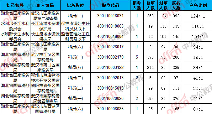 截止到1日16時(shí),競(jìng)爭(zhēng)比例的職位為湖北省國(guó)家稅務(wù)局科員一職,招錄1人,截止到1日16時(shí)通過(guò)人數(shù)為124人。