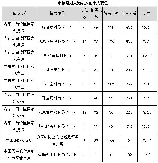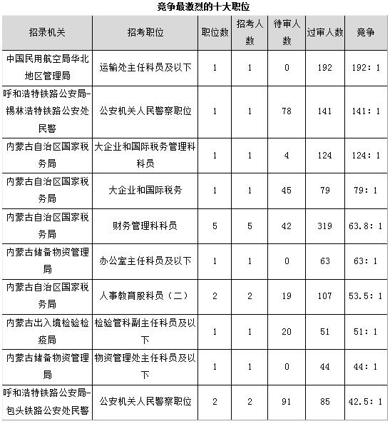 截止到11月1日日16時,競爭比例的部門為中國民用航空局華北地區(qū)管理局,招錄1人,截止到1日日16時待審人數(shù)0人,過審人數(shù)為192人,總計報名人數(shù)為192人,競爭比例為192:1,是報名第三天內(nèi)蒙古職位競爭力的職位。