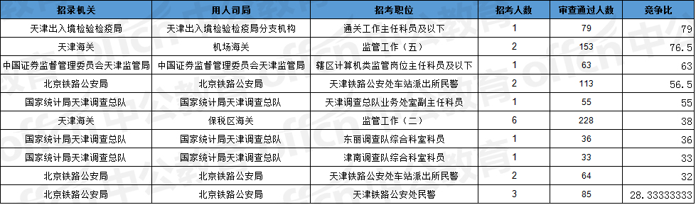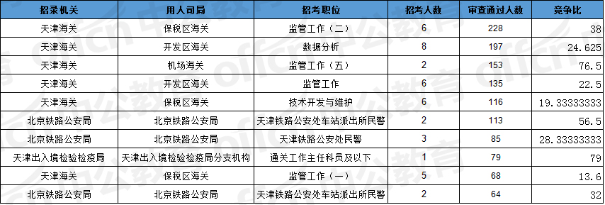 報名通過審核人數(shù)前十的職位主要集中在天津海關、北京鐵路公安局、天津出入境檢驗檢疫局等部門,具體信息如下: