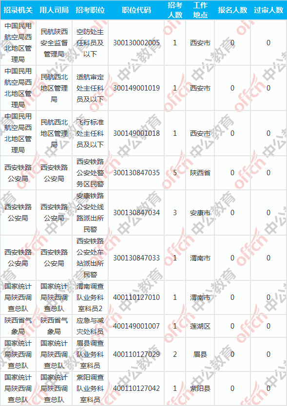 截至到2日9時,工作地點在陜西的職位共有10個無人報考,占全部職位的3.48%。下面是無人報考職位一覽表,中公網(wǎng)校專家建議廣大考生多關注一些較冷職位,避免激烈競爭,結合自身條件,找到屬于自己的職位。