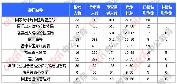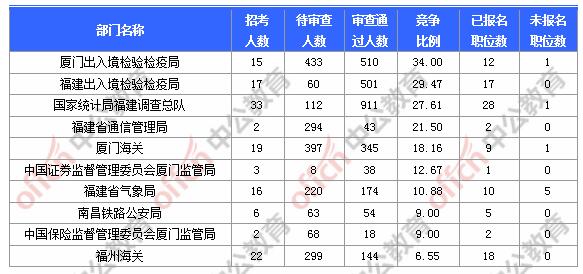 截止到2日9時(shí),通過(guò)審核人數(shù)前三位的部門依次是:國(guó)家統(tǒng)計(jì)局福建調(diào)查總隊(duì)、門出入境檢驗(yàn)檢疫局、福建出入境檢驗(yàn)檢疫局,三部門通過(guò)審核總?cè)藬?shù)達(dá)1922人,占通過(guò)審核總?cè)藬?shù)的61.03%。