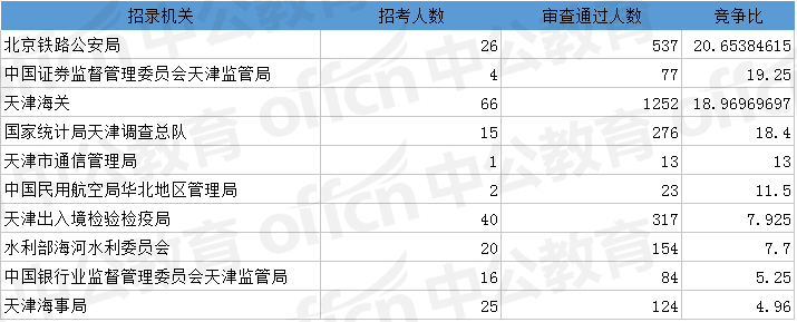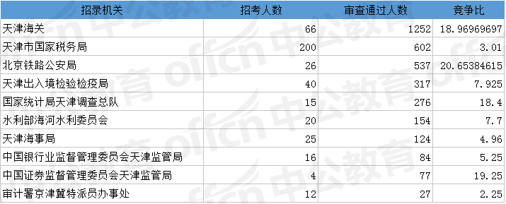 為幫助廣大考生更清晰的了解今日?qǐng)?bào)名情況,中公網(wǎng)校整理了審核通過(guò)人數(shù)前十位的部門以及競(jìng)爭(zhēng)比例最激烈的十大部門,供廣大考生參考: