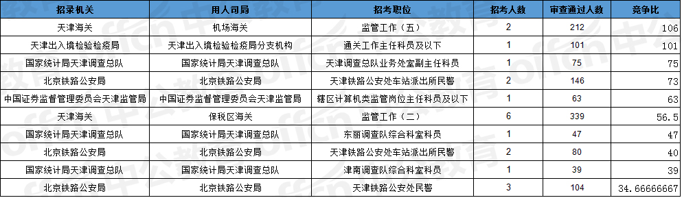 報名通過審核人數(shù)前十的職位主要集中在天津海關(guān)、北京鐵路公安局、天津出入境檢驗檢疫局等部門,具體信息如下: