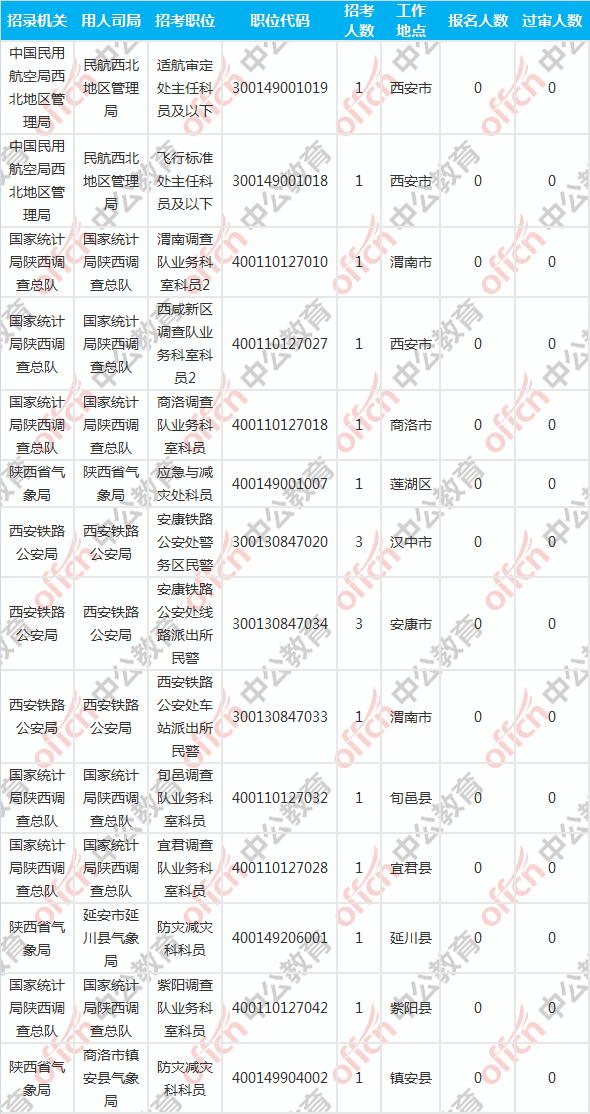 截至到2日16時,工作地點在陜西的職位共有14個無人報考,占全部職位的4.87%。下面是無人報考職位一覽表,中公網校專家建議廣大考生多關注一些較冷職位,避免激烈競爭,結合自身條件,找到屬于自己的職位。