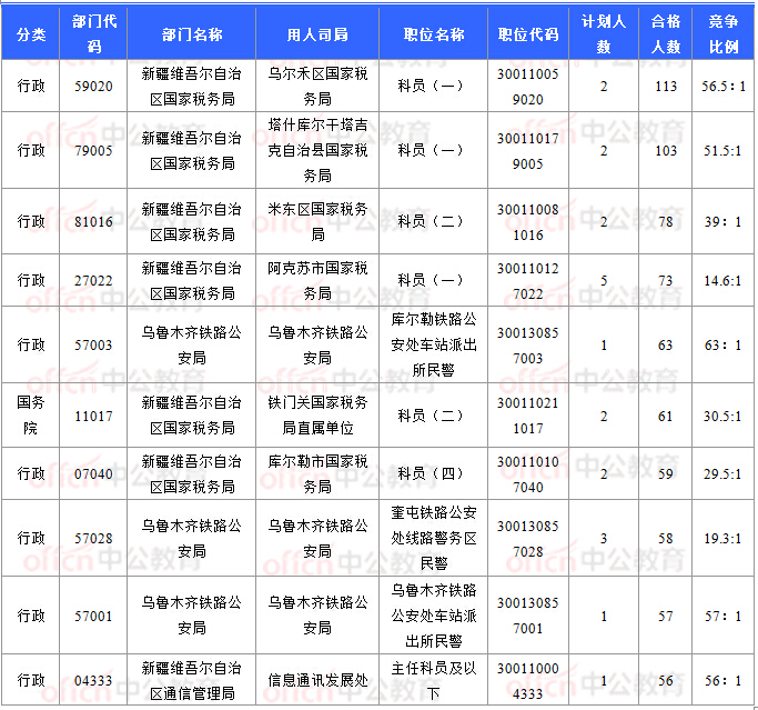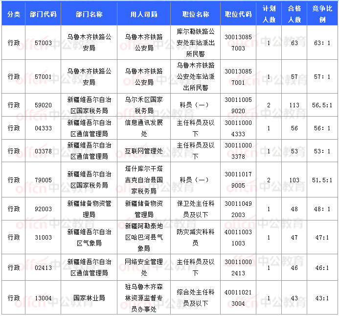 截止到11月2日16時(shí),競(jìng)爭(zhēng)比例的職位為烏魯木齊鐵路公安局庫(kù)爾勒鐵路公安處車站派出所民警一職,招錄1人,截止到2日16時(shí)通過(guò)人數(shù)為63人,尚有11人待審,再創(chuàng)新疆競(jìng)爭(zhēng)比例新高!