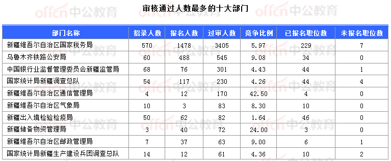 為幫助廣大考生更清晰的了解今日?qǐng)?bào)名情況,中公教育整理了審核通過(guò)人數(shù)前十位的部門(mén)以及競(jìng)爭(zhēng)比例最激烈的十大部門(mén),供廣大考生參考: