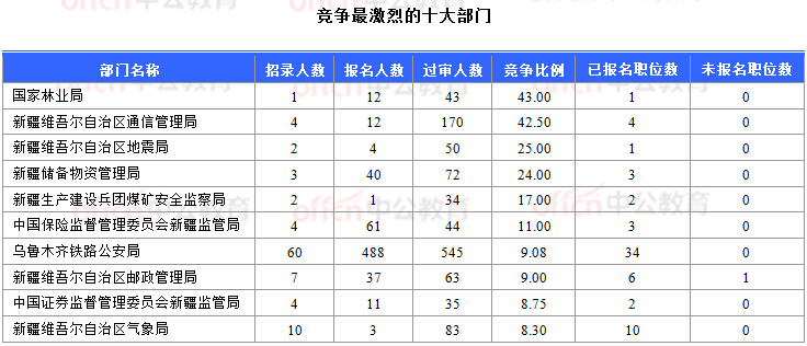 報(bào)名通過(guò)審核人數(shù)前十的職位主要集中在烏魯木齊鐵路公安局、新疆維吾爾自治區(qū)國(guó)家稅務(wù)局、新疆維吾爾自治區(qū)通信管理局、新疆維吾爾自治區(qū)郵政管理局,具體信息如下: