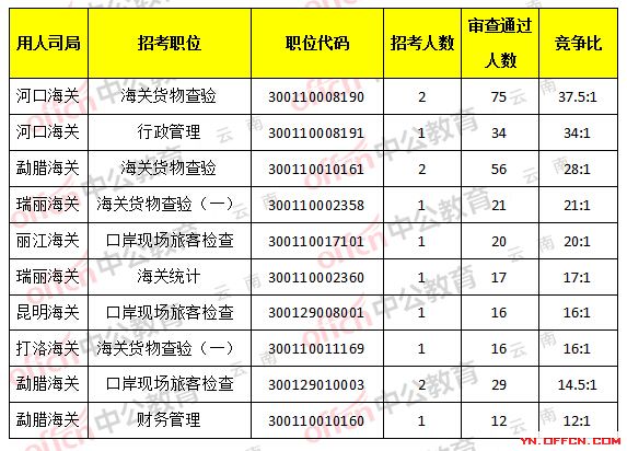 2018國家公務(wù)員海關(guān)報名人數(shù)截止11月2日:河口海關(guān)海關(guān)貨物查驗,職位代碼:300110008190,招錄2人,審查通過人數(shù)為75人,暫時競爭比為37.5:1,具體信息如下: