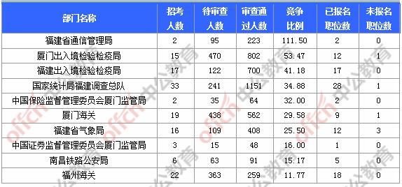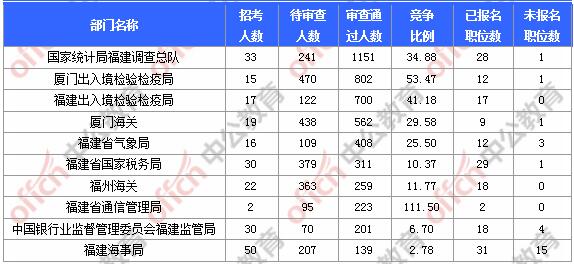 截止到3日9時,通過審核人數(shù)前三位的部門依次是:國家統(tǒng)計局福建調(diào)查總隊、廈門出入境檢驗檢疫局、福建出入境檢驗檢疫局,三部門通過審核總?cè)藬?shù)達2653人,占通過審核總?cè)藬?shù)的52.79%。