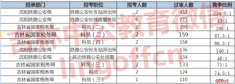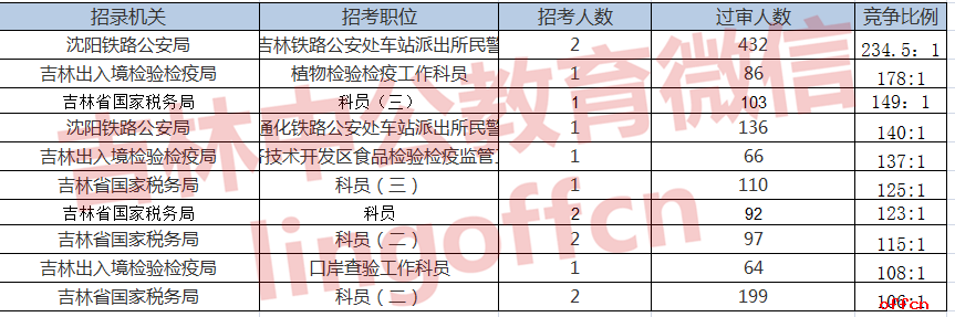 報(bào)名通過(guò)審核人數(shù)前十的職位主要集中在沈陽(yáng)鐵路公安局、吉林國(guó)家稅務(wù)局、吉林出入境檢疫檢驗(yàn)局等部門,具體信息如下: