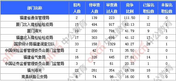 截止到3日16時,通過審核人數(shù)前三位的部門依次是:國家統(tǒng)計局福建調(diào)查總隊、廈門出入境檢驗檢疫局、廈門海關(guān),三部門通過審核總?cè)藬?shù)達3040人,占通過審核總?cè)藬?shù)的52.19%。