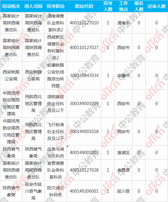截至到3日16時(shí),工作地點(diǎn)在陜西的職位共有8個(gè)無人報(bào)考,占全部職位的2.79%。下面是無人報(bào)考職位一覽表,中公網(wǎng)校建議廣大考生多關(guān)注一些較冷職位,避免激烈競爭,結(jié)合自身?xiàng)l件,找到屬于自己的職位。