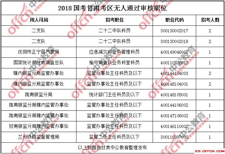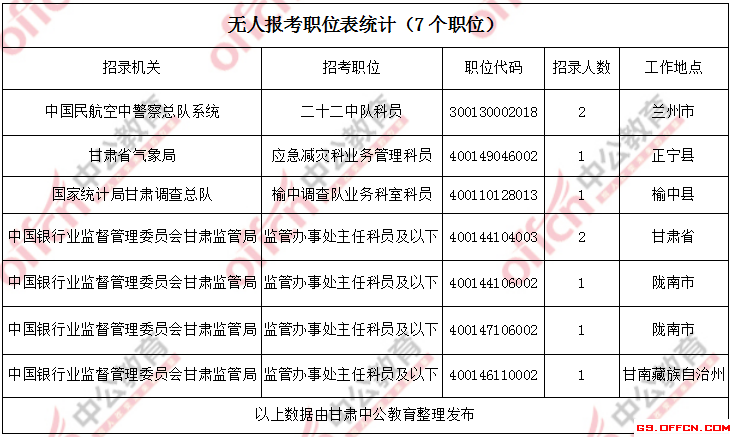 11月3日16時,工作地點(diǎn)在甘肅的職位共有11個無人待審,占全部職位的5.02%,7個職位無人報考,占全部職位的3.2%。下面是無人待審及無人報報職位一覽表,中公網(wǎng)校專家建議廣大考生多關(guān)注一些較冷職位,避免激烈競爭,結(jié)合自身?xiàng)l件,找到屬于自己的職位。