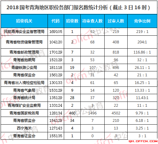 以下是3日16時(shí)各部門報(bào)名人數(shù)統(tǒng)計(jì)分析,其中中國(guó)民航青海安全監(jiān)督管理局、青海省物資儲(chǔ)備管理局、青海省郵政管理局等三個(gè)部門競(jìng)爭(zhēng)最激烈,競(jìng)爭(zhēng)比均超過(guò)116:1。