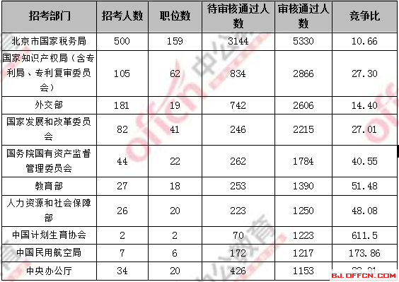 本次國考,北京國稅是北京地區(qū)招錄人數(shù)最多的部門,共招錄500人,目前審核通過的人數(shù)為5330人,待審核人數(shù)為3144,競爭比為11:1,這也能看得出考生對于學(xué)生對于國稅的喜愛。在報(bào)名最多的10個(gè)部門中,由于大部分中央部門都在北京,所以這也是北京整體報(bào)考人數(shù)較多的原因。