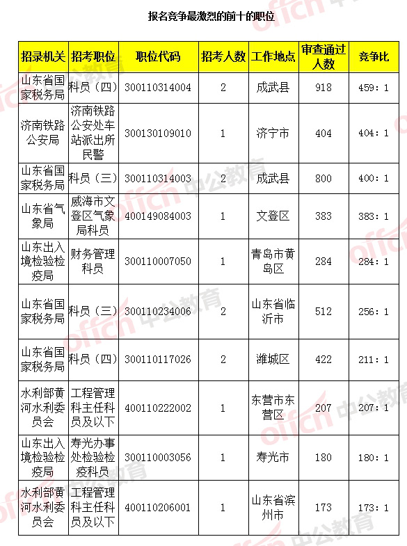 2018國(guó)家公務(wù)員考試報(bào)名進(jìn)入第五日,截至11月3日16時(shí),報(bào)名人數(shù)已達(dá)26871,過(guò)審人數(shù)達(dá)23499,最熱職位為成武縣國(guó)家稅務(wù)局科員(四)一職,競(jìng)爭(zhēng)比高達(dá)459:1;而濟(jì)南鐵路公安局濟(jì)南鐵路公安處車站派出所民警一職更是緊隨其后,招錄人數(shù)僅1人,競(jìng)爭(zhēng)比達(dá)404:1。