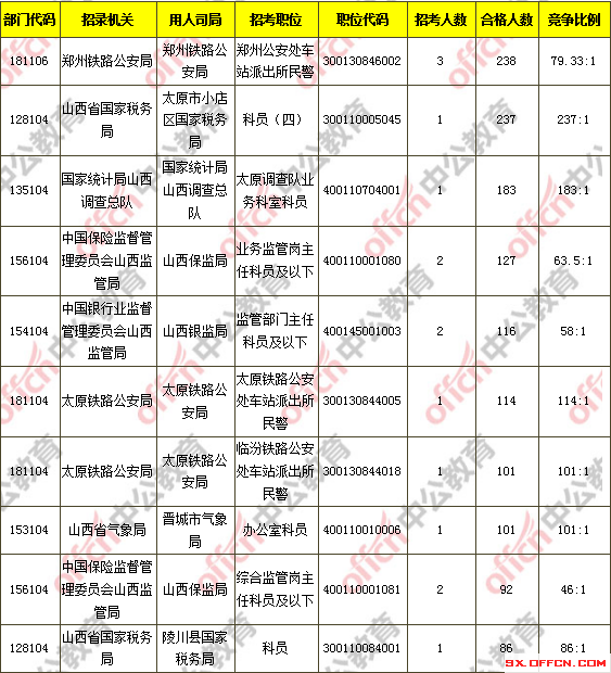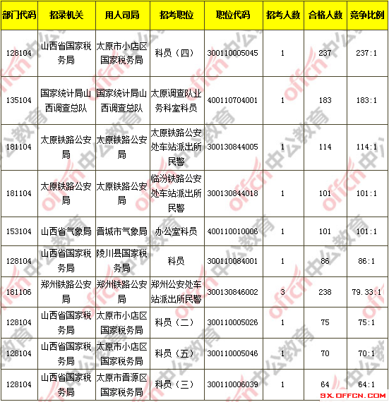 報名通過審核人數(shù)前十的職位主要集中在鄭州鐵路公安局、山西省國家稅務(wù)局、國家統(tǒng)計局山西調(diào)查總隊等部門,具體信息如下:
