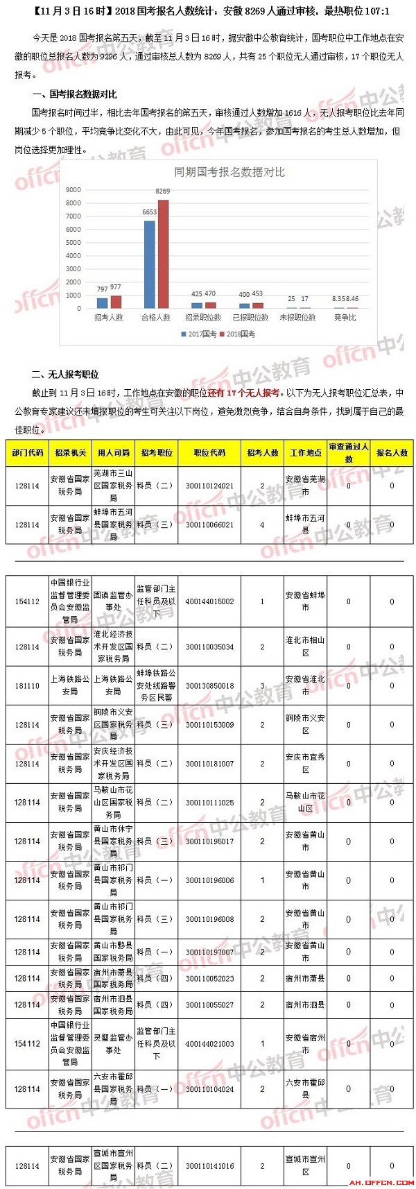 【11月3日16時(shí)】2018國(guó)考報(bào)名人數(shù)統(tǒng)計(jì):安徽8269人通過審核,最熱職位107:1