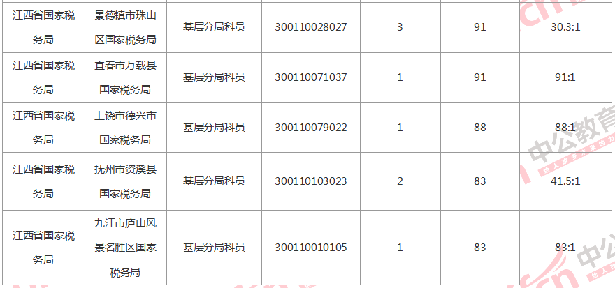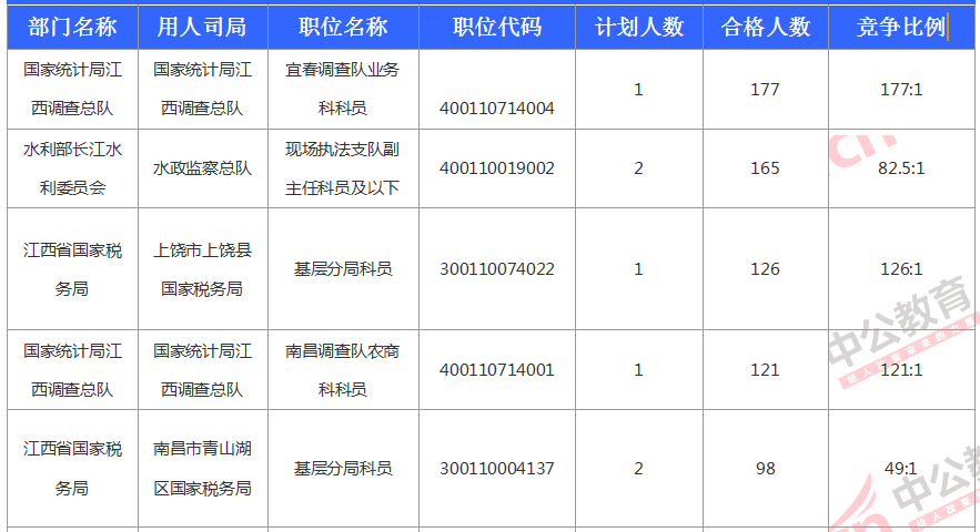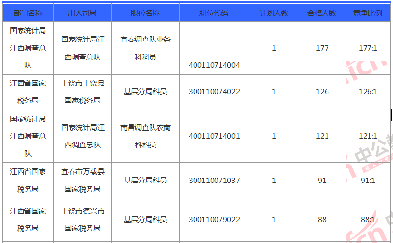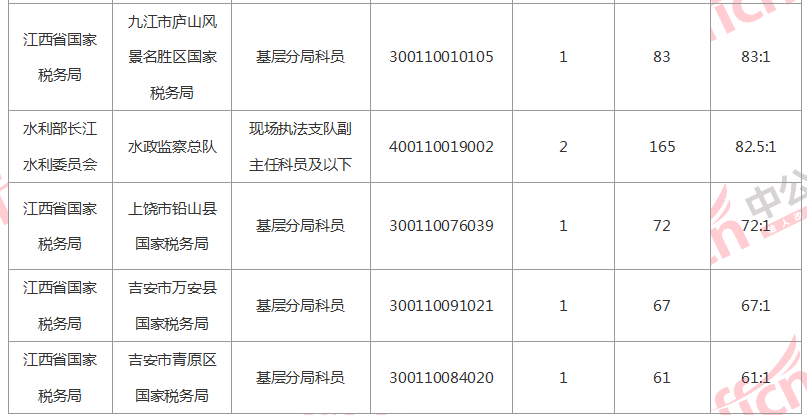 報(bào)名通過審核人數(shù)前十的職位主要集中在江西省國(guó)家稅務(wù)局、國(guó)家統(tǒng)計(jì)局江西調(diào)查總隊(duì)、水利部長(zhǎng)江水利委員會(huì)等部門,具體信息如下: