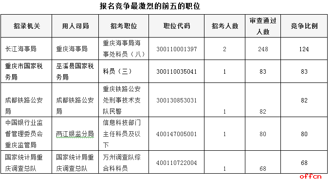 報(bào)名通過審核人數(shù)前五的職位主要集中在中國銀行業(yè)監(jiān)督管理委員會重慶監(jiān)管局、長江海事局、重慶市國家稅務(wù)局等部門,具體信息如下: