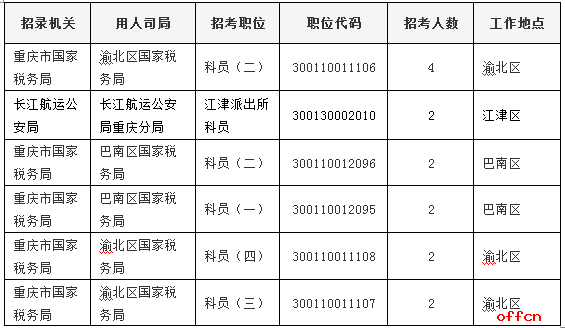 截止到11月3日16時(shí),工作地點(diǎn)在重慶的職位共有18個(gè)無人報(bào)考,占全部職位的7.6%。下面是無人報(bào)考職位招錄人數(shù)較多的職位一覽表,中公網(wǎng)校專家建議廣大考生多關(guān)注一些較冷職位,避免激烈競爭,結(jié)合自身?xiàng)l件,找到屬于自己的職位。