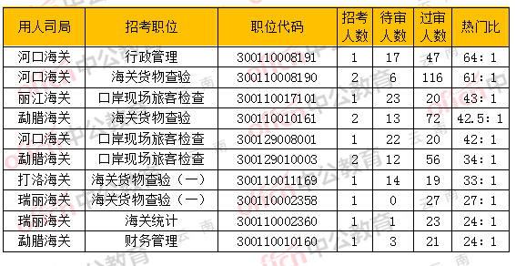 當前河口海關(guān)行政管理,職位代碼300110008191的崗位相比報名人數(shù)為多,招1人,17人報名待審,47人過審,熱門比為:64:1