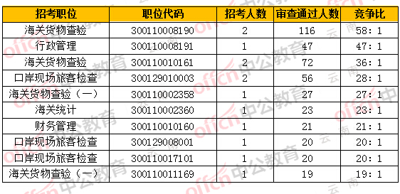 2018國家公務員海關(guān)報名人數(shù)截止11月3日:河口海關(guān)海關(guān)貨物查驗,職位代碼:300110008190,招錄2人,審查通過人數(shù)為116人,暫時競爭比為58:1,具體信息如下: