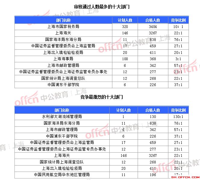 為幫助廣大考生更清晰的了解今日報名情況,中公網(wǎng)校整理了審核通過人數(shù)前十位的部門以及競爭比例最激烈的十大部門,供廣大考生參考: