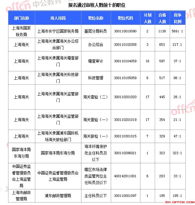 報名通過審核人數(shù)前十的職位主要集中在上海市國家稅務(wù)局、上海海關(guān)、國家海洋局東海分局等部門,具體信息如下: