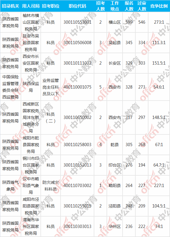 報(bào)名人數(shù)前十的職位主要集中在陜西省國家稅務(wù)局、中國保險(xiǎn)監(jiān)督管理委員會(huì)陜西監(jiān)管局、陜西省氣象局等部門,具體信息如下: