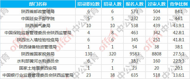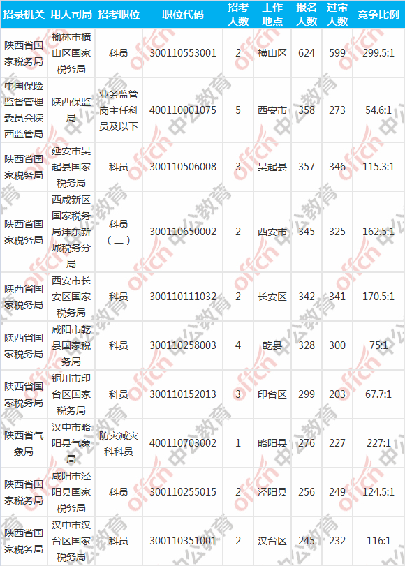 報(bào)名人數(shù)前十的職位主要集中在陜西省國(guó)家稅務(wù)局、中國(guó)保險(xiǎn)監(jiān)督管理委員會(huì)陜西監(jiān)管局、陜西省氣象局等部門,具體信息如下: