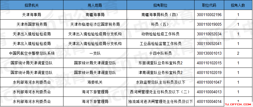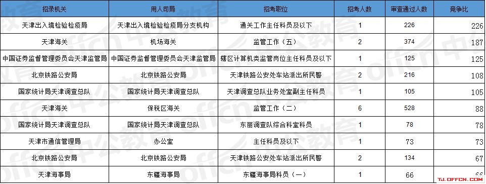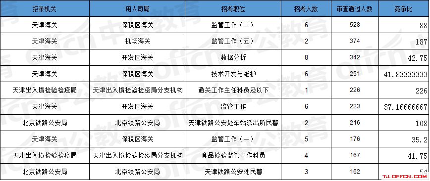 報(bào)名通過審核人數(shù)前十的職位主要集中在天津海關(guān)、北京鐵路公安局、天津出入境檢驗(yàn)檢疫局等部門,具體信息如下: