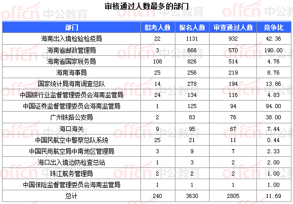 截止到4日16時,通過審核人數(shù)前三位的部門依次是:海南出入境檢驗檢疫局、海南省郵政管理局、海南省國家稅務(wù)局,三部門通過審核總?cè)藬?shù)達2016人,占通過審核總?cè)藬?shù)的71.87%。