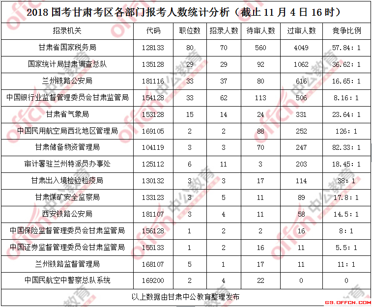 [11月4日16時]甘肅2018國考報名人數(shù)統(tǒng)計:過審7565人 最熱競爭比例489:1