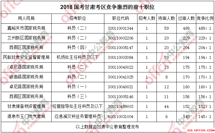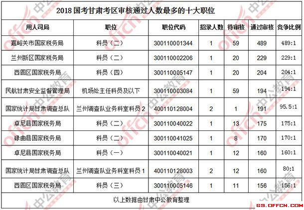 報名通過審核人數(shù)前十的職位主要集中在嘉峪關(guān)市國家稅務(wù)局、蘭州新區(qū)國家稅務(wù)局、西固區(qū)國家稅務(wù)局等部門,具體信息如下: