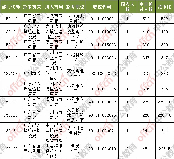 報名通過審核人數(shù)前十的職位主要集中在深圳海關(guān)、廣東省氣象局、廣東省國家稅務(wù)局等部門,具體信息如下: