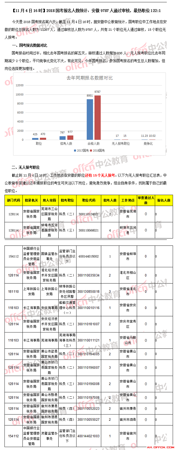【11月4日16時(shí)】2018國考報(bào)名人數(shù)統(tǒng)計(jì):安徽9787人通過審核,最熱職位122:1
