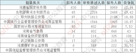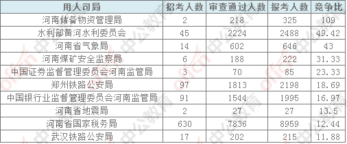 為幫助廣大考生更清晰的了解今日報名情況,中公網(wǎng)校整理了審核通過人數(shù)前十位的部門以及競爭比例最激烈的十個部門,供廣大考生參考: