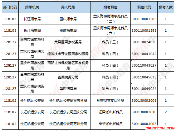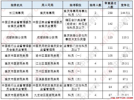 報名通過審核人數(shù)前十的職位主要集中在長江海事局、重慶市國家稅務(wù)局、中國證券監(jiān)督管理委員會重慶監(jiān)管局、成都鐵路公安局四個部門,具體信息如下:
