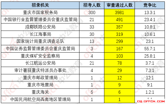 為幫助廣大考生更清晰的了解今日報名情況,重慶中公網(wǎng)校整理了重慶市招錄機關(guān)的招錄情況,供廣大考生參考: