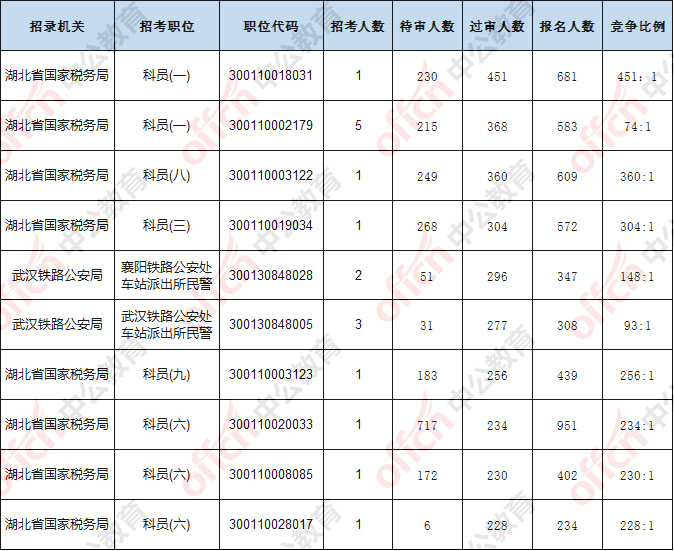 報(bào)名通過審核人數(shù)前十的職位主要集中在湖北省國(guó)家稅務(wù)局、武漢鐵路公安局等部門,具體信息如下: