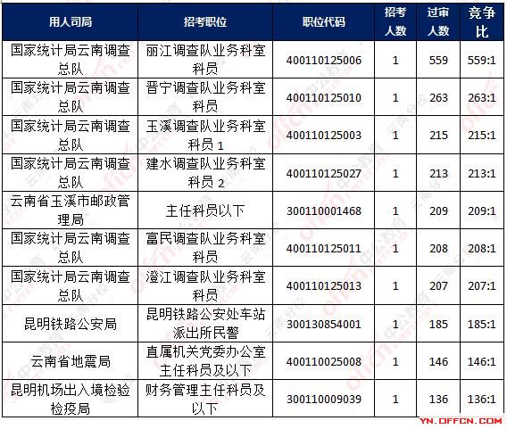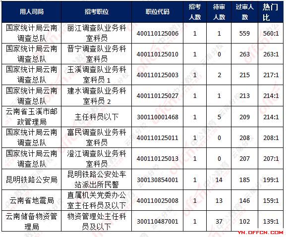 當(dāng)前最受歡迎的崗位是國家統(tǒng)計局云南調(diào)查總隊,麗江調(diào)查隊業(yè)務(wù)科室科員,職位代碼:400110125006,招錄1人,560人報名,其中1人待審核通過,詳情如下圖: