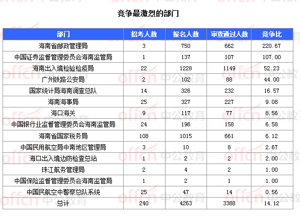為幫助廣大考生更清晰的了解今日報名情況,中公網(wǎng)校整理了審核通過人數(shù)的部門以及競爭比例最激烈的部門,供廣大考生參考: