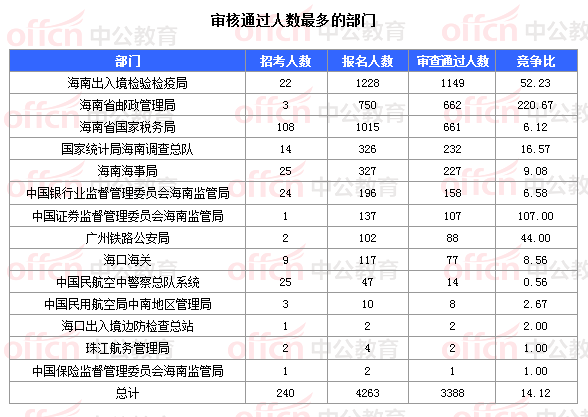 截止到5日16時,通過審核人數(shù)前三位的部門依次是:海南出入境檢驗檢疫局、海南省郵政管理局、海南省國家稅務(wù)局,三部門通過審核總?cè)藬?shù)達2472人,占通過審核總?cè)藬?shù)的72.96%。