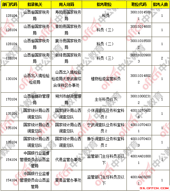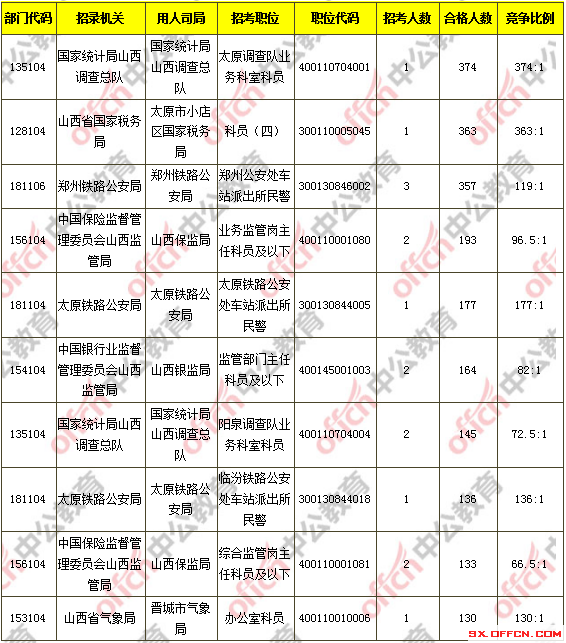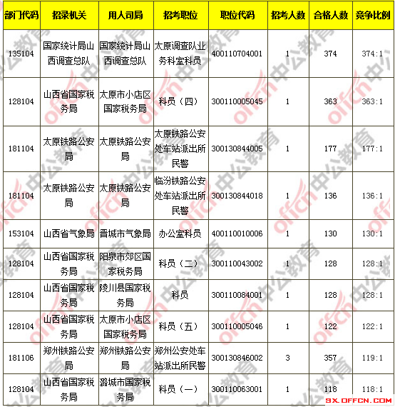 報名通過審核人數(shù)前十的職位主要集中在國家統(tǒng)計局山西調(diào)查總隊、山西省國家稅務(wù)局、太原鐵路公安局等部門,具體信息如下: