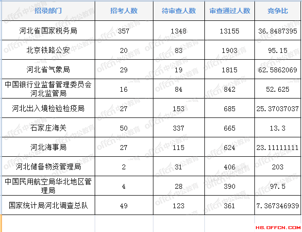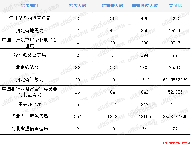 報(bào)名通過(guò)審核人數(shù)前十的職位主要集中在河北省氣象局、北京鐵路公安局、中國(guó)民用航空局華北地區(qū)管理局等部門,具體信息如下: