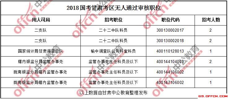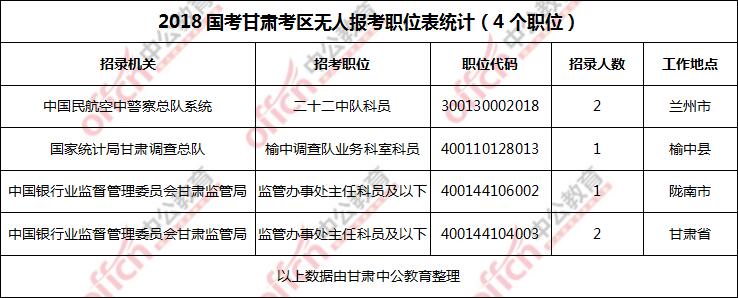 11月5日16時(shí),工作地點(diǎn)在甘肅的職位共有6個(gè)職位無(wú)人通過審核,占全部職位的2.1%,4個(gè)職位無(wú)人報(bào)考,占全部職位的1.83%。下面是無(wú)人待審及無(wú)人報(bào)報(bào)職位一覽表,中公網(wǎng)校專家建議廣大考生多關(guān)注一些較冷職位,避免激烈競(jìng)爭(zhēng),結(jié)合自身?xiàng)l件,找到屬于自己的職位。