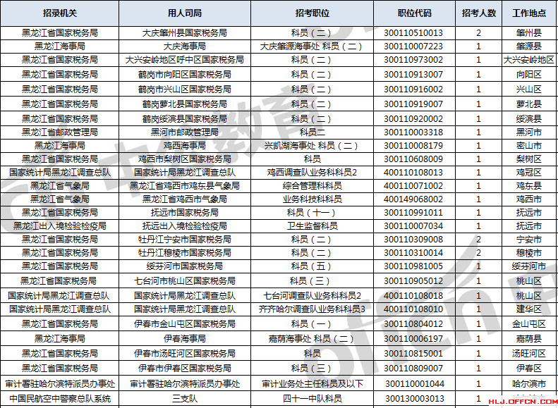 截止到5日16時,工作地點在黑龍江的職位共有40個職位無人通過審核,有27個職位無人報名,下面是無人報考職位一覽表,中公網校專家建議廣大考生多關注一些較冷職位,避免激烈競爭,結合自身條件,找到屬于自己的職位。