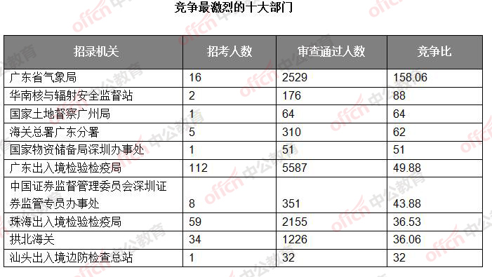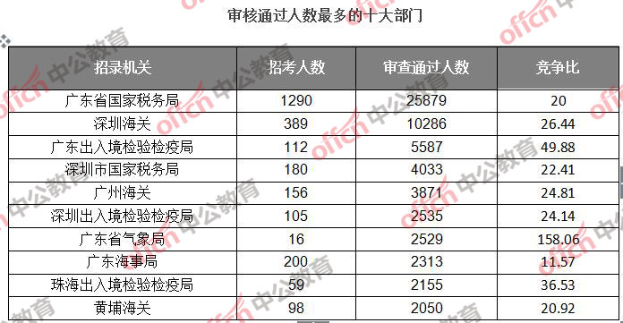 為幫助廣大考生更清晰的了解今日報名情況,中公教育整理了審核通過人數(shù)前十位的部門以及競爭比例最激烈的十大部門,供廣大考生參考: